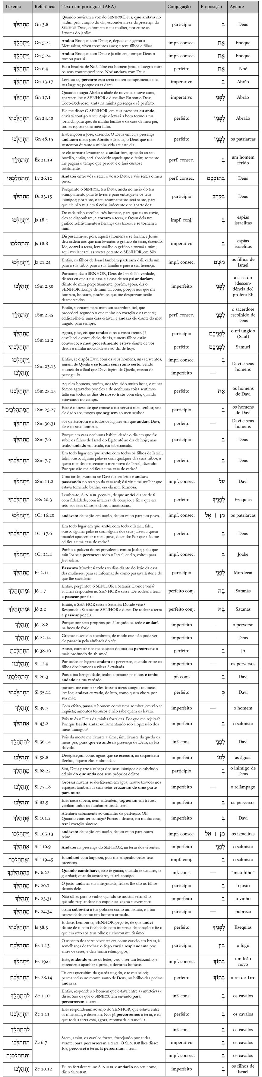 Enfim, a figura acima mostra três dados importantes para cada uma das 64 ocorrências do verbo הלך no hithpael: 1) a conjugação, 2) a preposição e 3) o agente. Por que esses três?