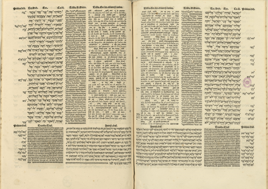 Vocabulário! Palavras novas são sempre difíceis. Acima, vemos a Bíblia poliglota complutense, a primeira Bíblia poliglota impressa (1514-1517), incluindo versões diferentes da Bíblia em grego, hebraico, aramaico e latim. Imagine o trabalhão naqueles tempos de se aprender cada uma dessas línguas!